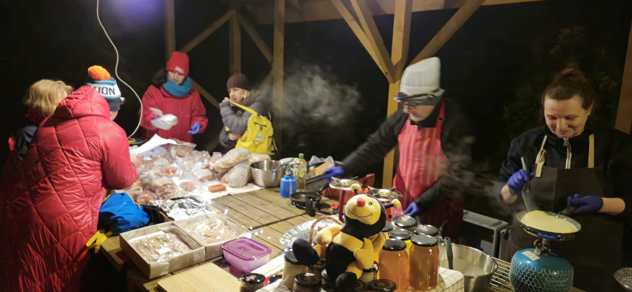Organizatorzy miło zaskoczyli nas poczęstunkiem w postaci miodowych pyszności, które przygotowali Pszczelarze „Z Doliny Iny”. Reklamując słodkości częstowali nas swoimi wyrobami. Bardzo smakowały nam migdały w miodzie rzepakowym, ale były też miody z owocami – gruszką, maliną i żurawiną. Degustowaliśmy to wszystko z gorącymi naleśniczkami i panienkami pieczonymi pod wiatą.