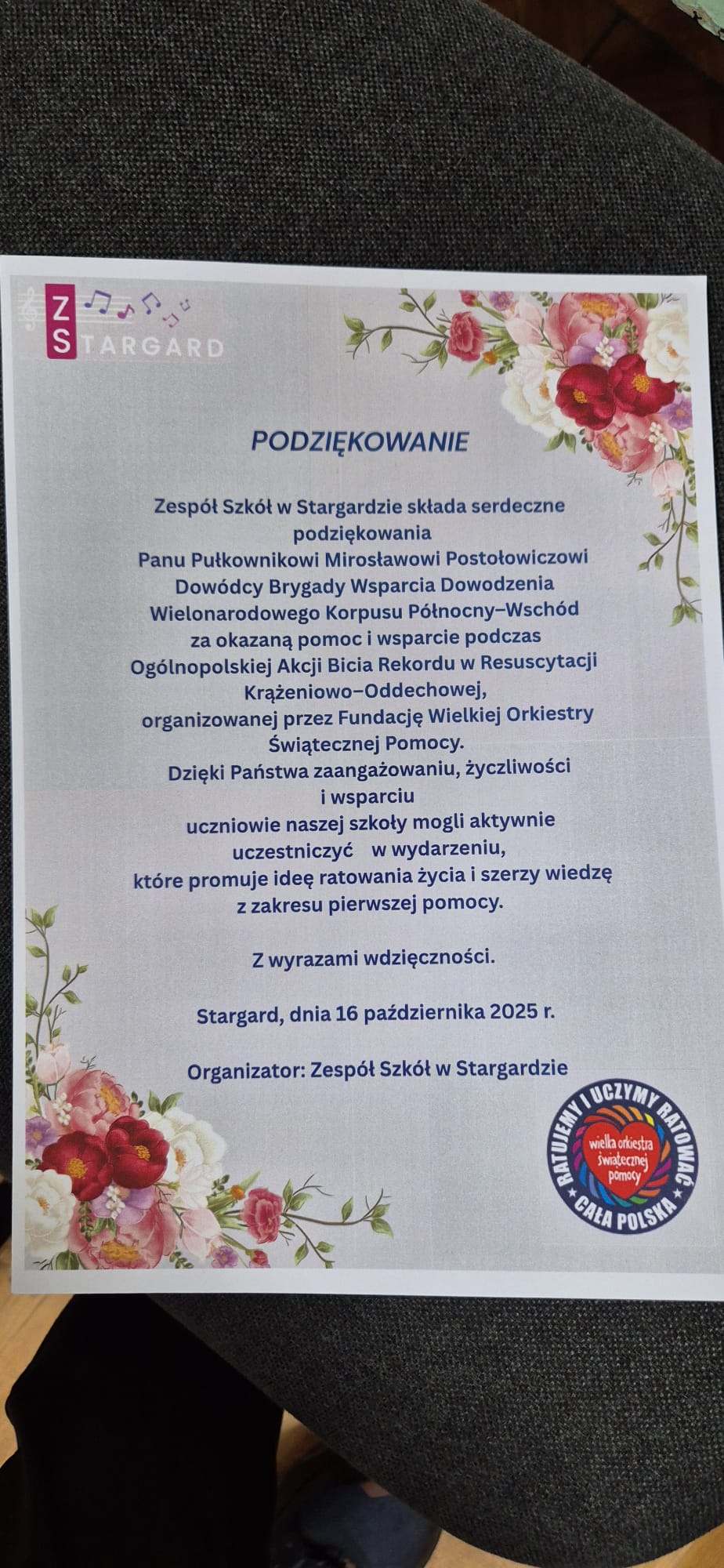 16 października w naszej szkole odbyły się warsztaty z pierwszej pomocy. Zespół Szkół w Stargardzie wziął udział w Ogólnopolskiej Akcji Bicia Rekordu w Resuscytacji Krążeniowo–Oddechowej, organizowanej w ramach inicjatywy wspieranej przez Wielką Orkiestrę Świątecznej Pomocy. Składamy serdeczne podziękowania Panu Pułkownikowi Mirosławowi Postołowiczowi, Dowódcy Brygady Wsparcia Dowodzenia Wielonarodowego Korpusu Północny–Wschód, za okazane wsparcie, fachowy instruktaż oraz...