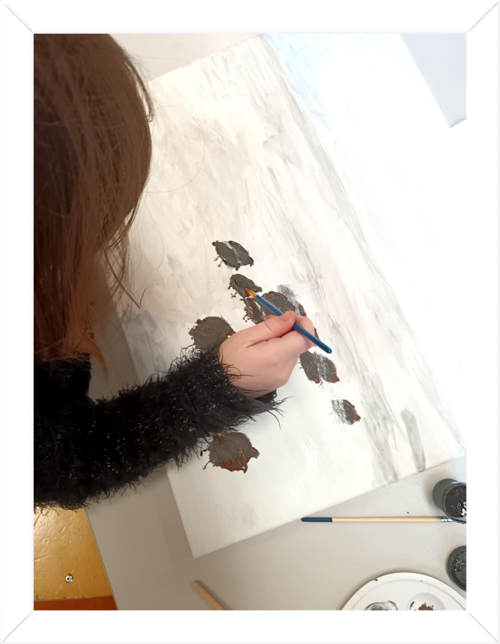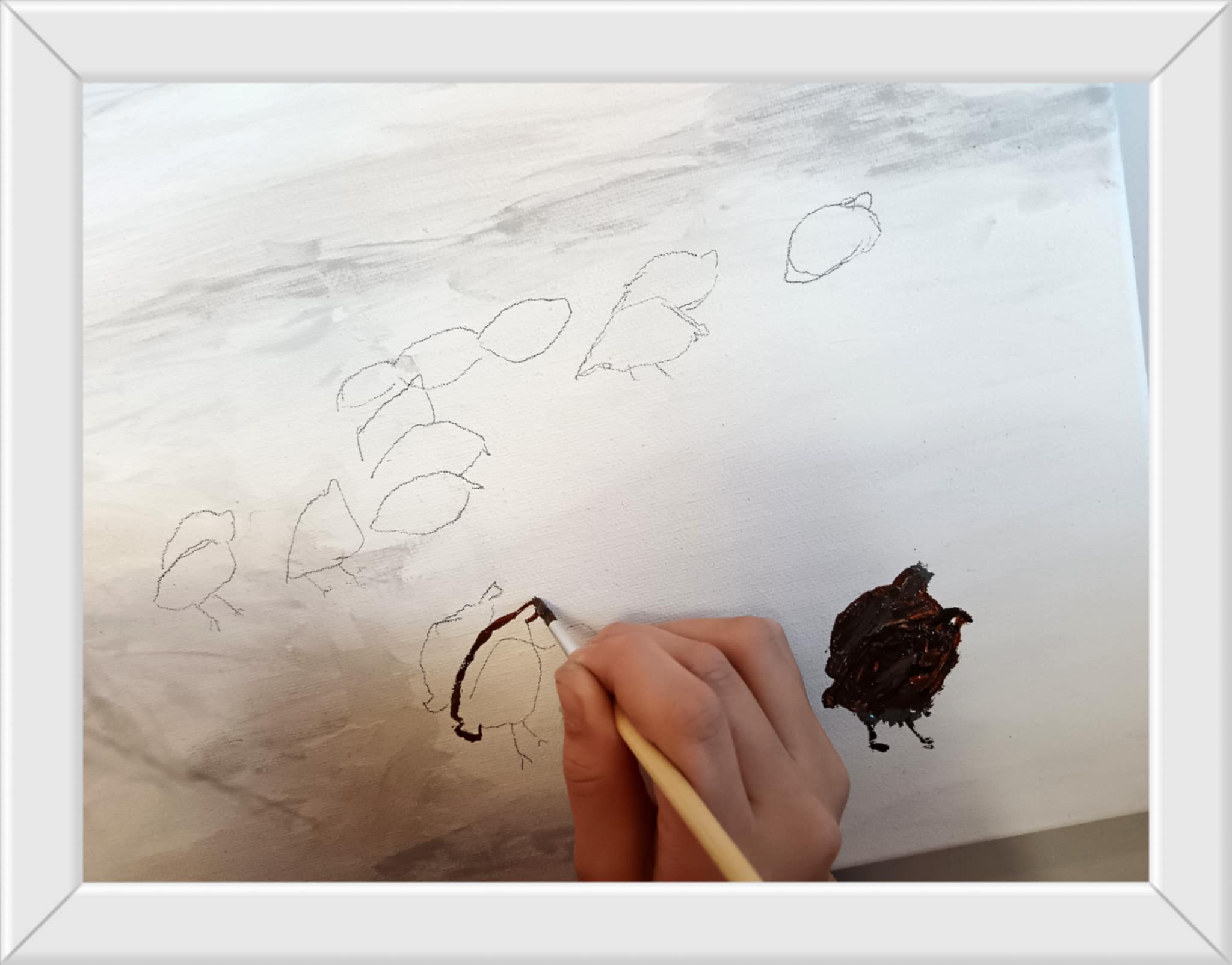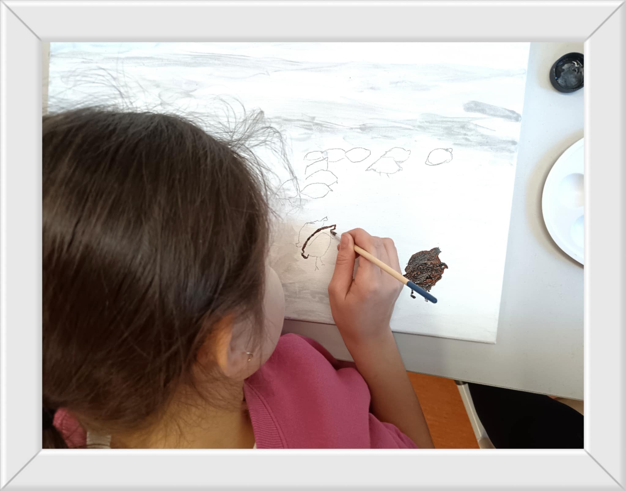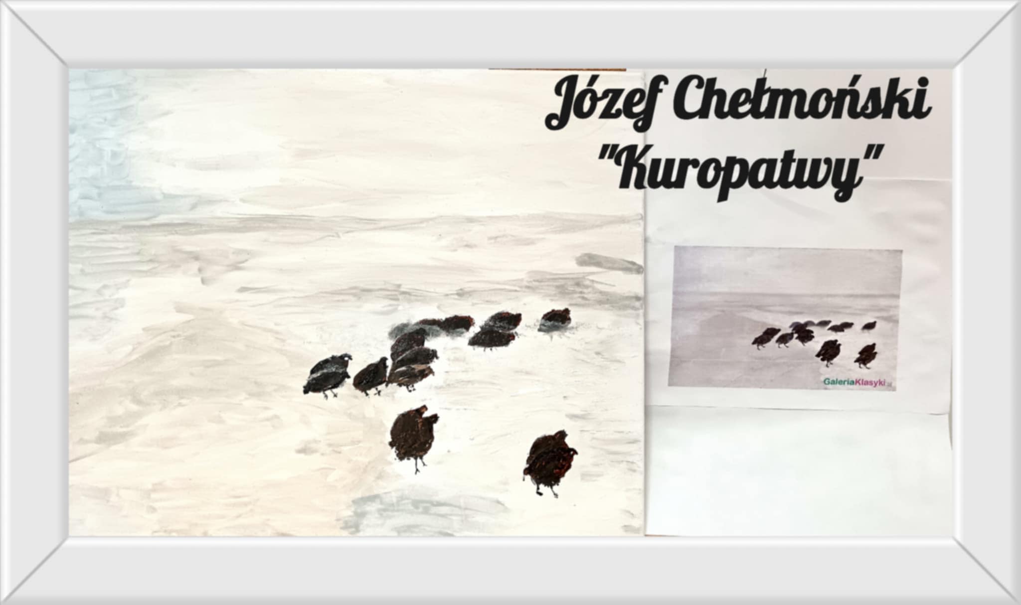 Tematyka zimowa. Dzieci wspaniale odtworzyły obraz malarza Józefa Chełmońskiego „Kuropatwy”.