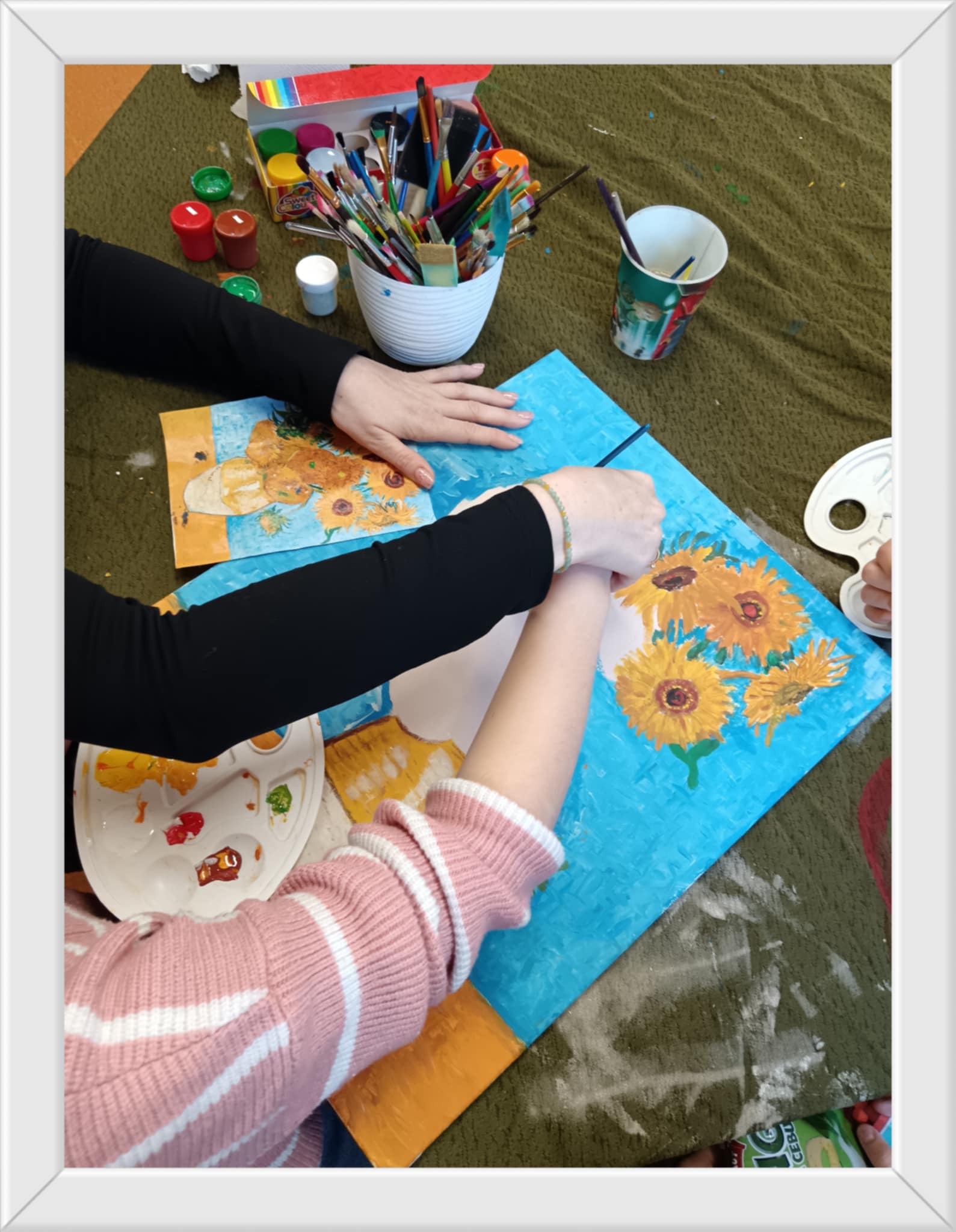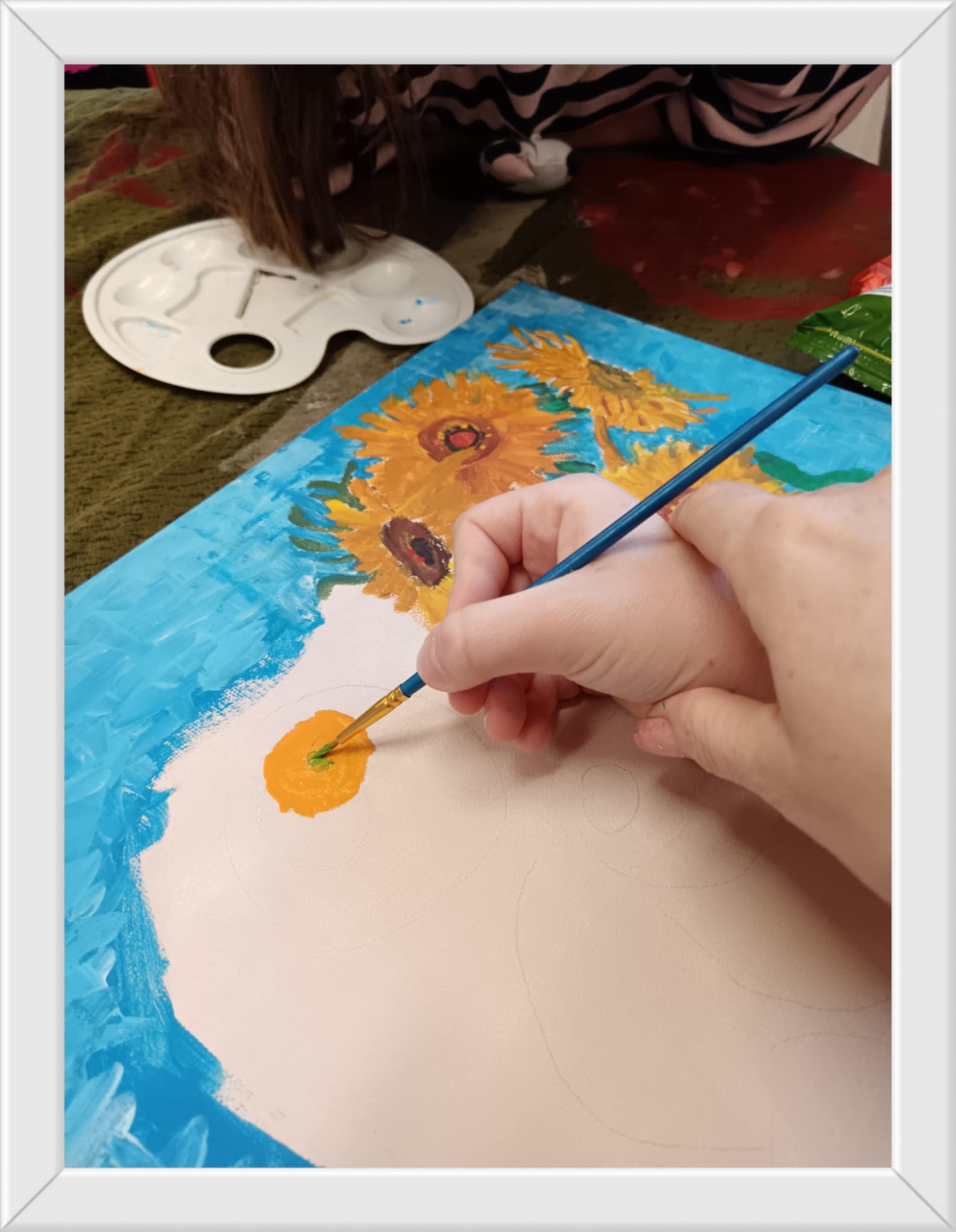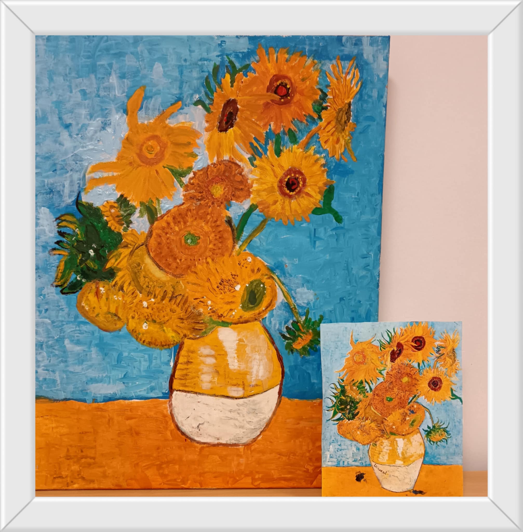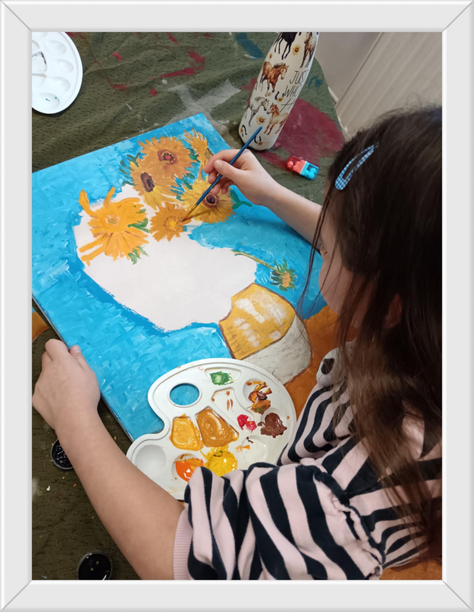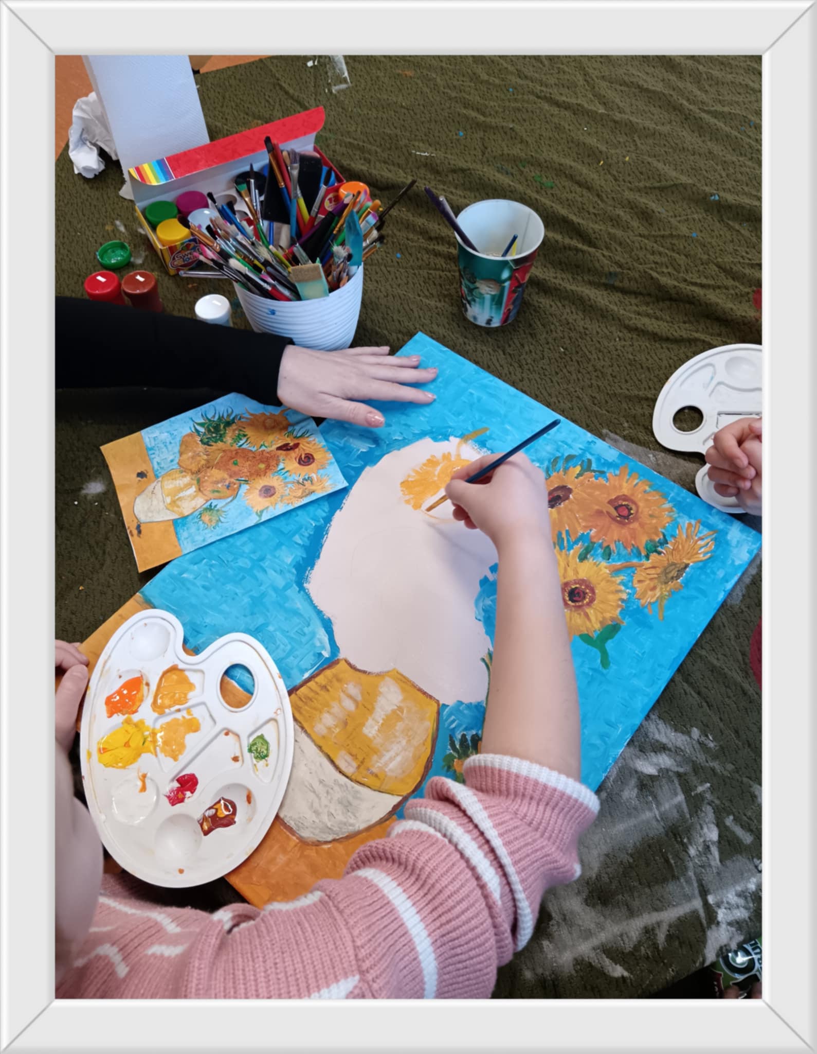 Innowacja pedagogiczna „Śladami wielkich malarzy” Tym razem uczennice z klasy IIa zmierzy się z odwzorowaniem wspaniałego dzieła ” Słoneczniki” Vincenta Van Gogha. Piękna praca dzieci wykonana z ogromną pieczołowitością zachwyca.