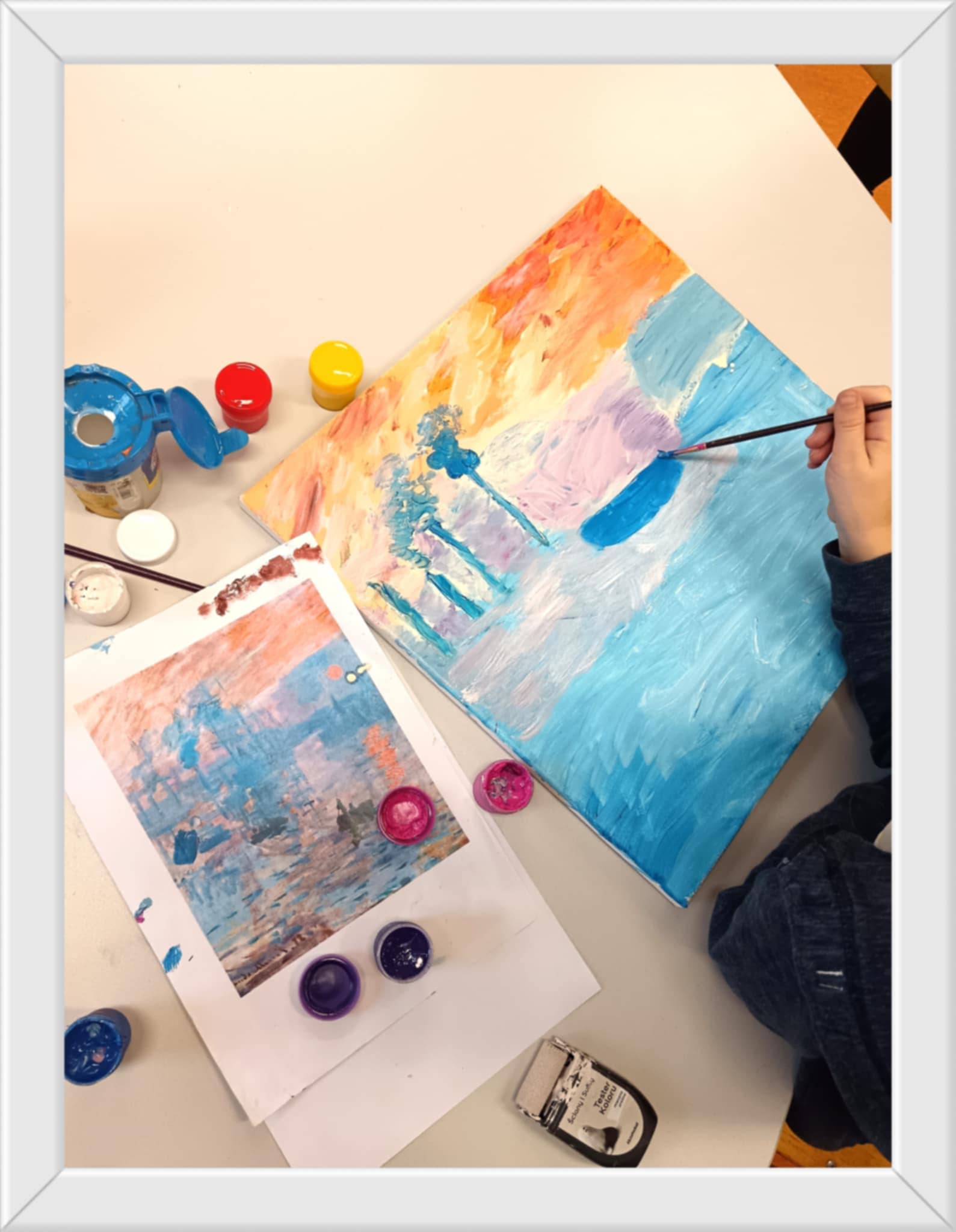Dzieci ze świetlicy pięknie poradziły sobie z odtworzeniem obrazu „Impresja wschód słońca” autor Claude Monet.