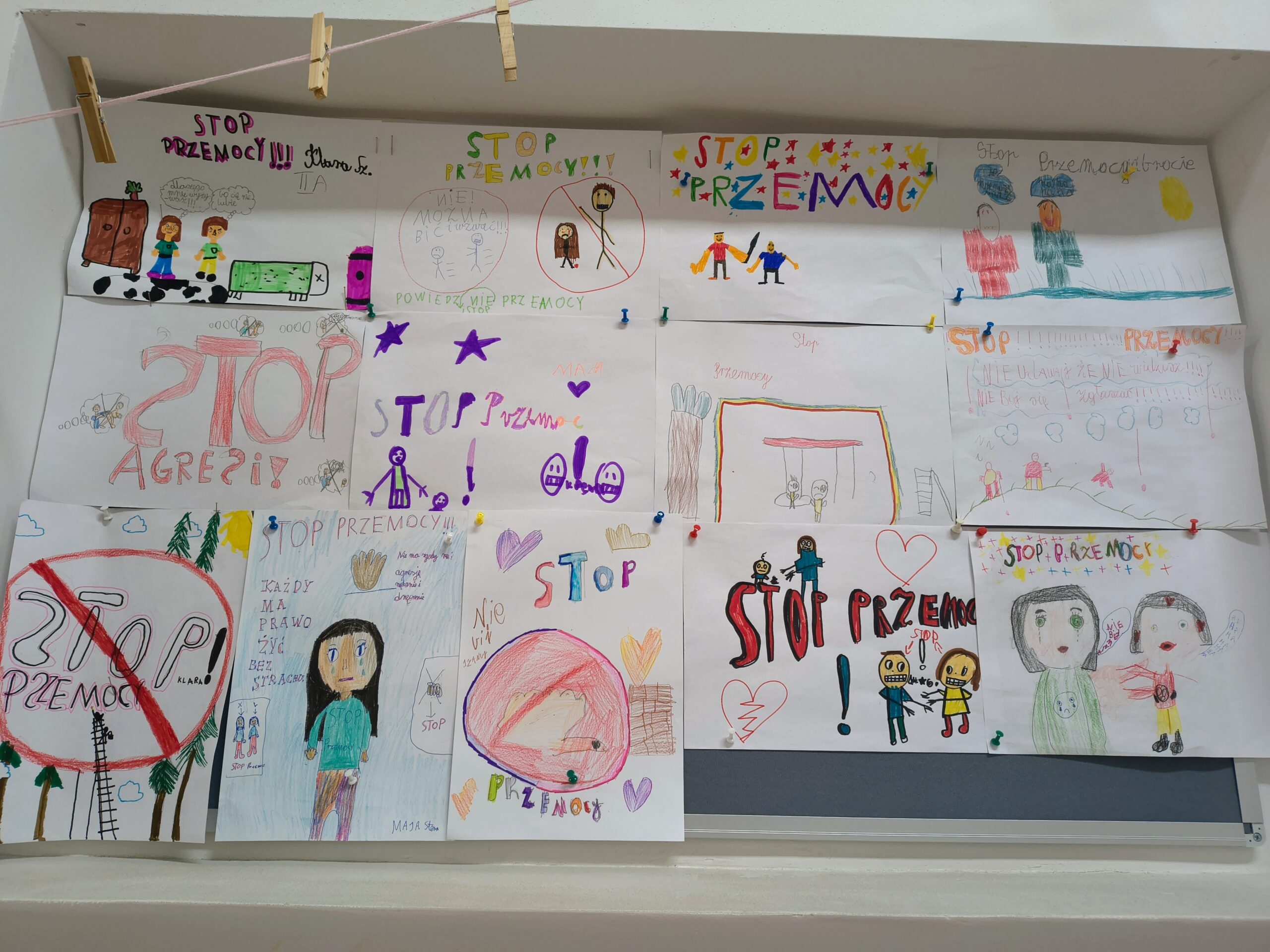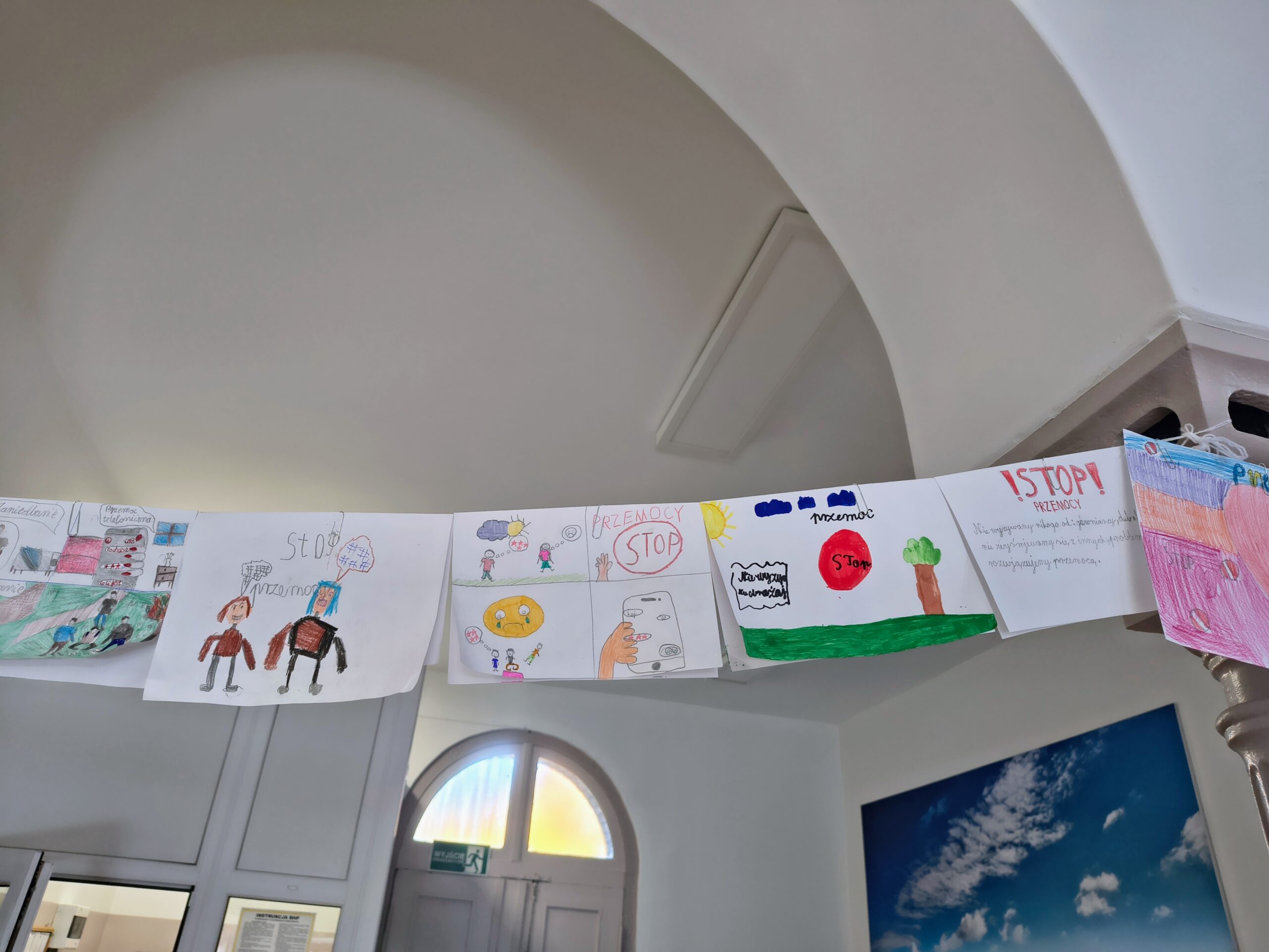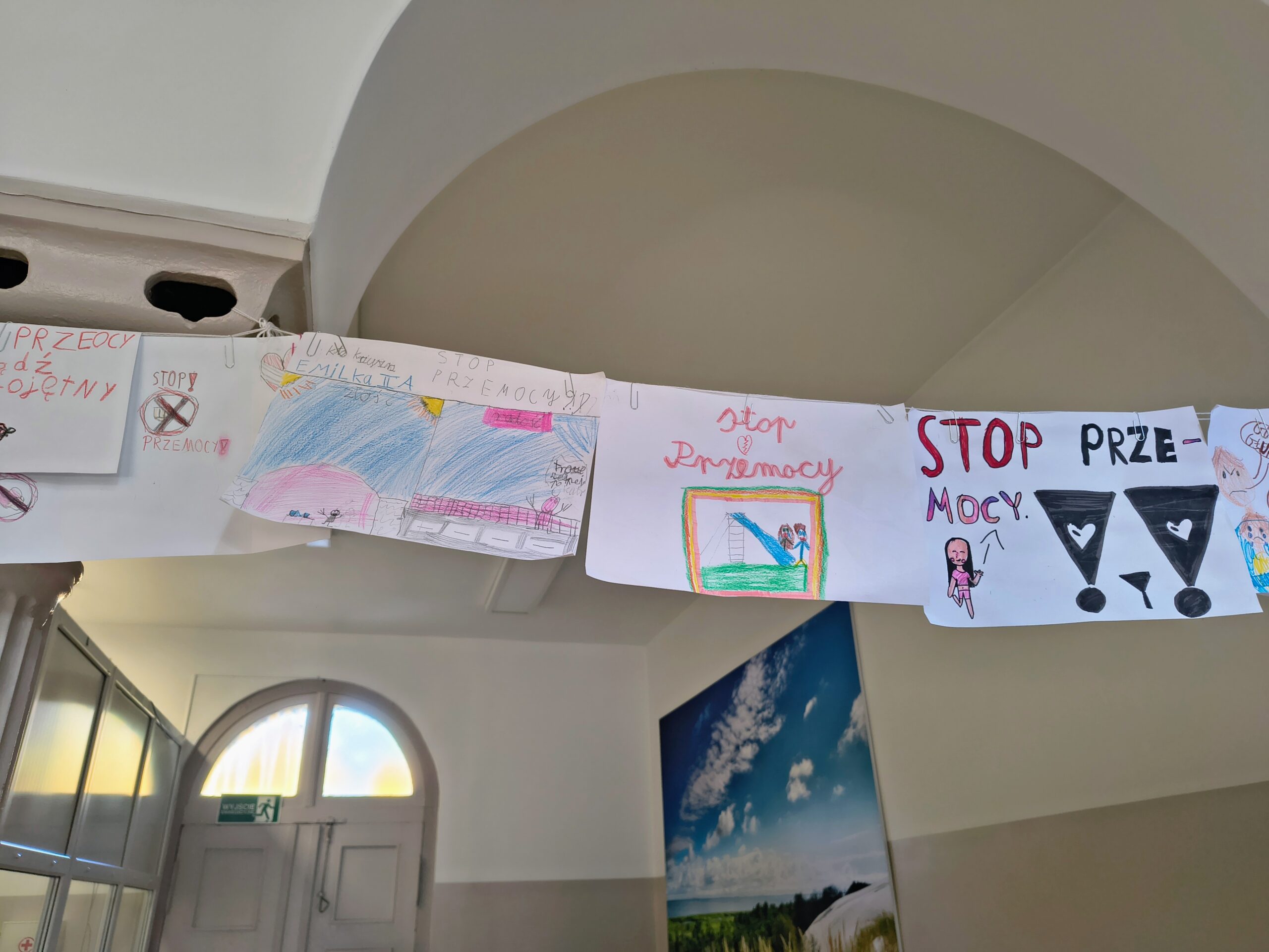 Najmłodsi uczniowie – klasy I–III – aktywnie włączyli się w obchody, przygotowując kolorowe plakaty pod hasłem „Stop Przemocy”, które ozdobiły szkolny korytarz i zwracały uwagę na potrzebę reagowania na krzywdę innych. Powstała również gazetka szkolna poświęcona tematyce przeciwdziałania przemocy, a w różnych częściach szkoły – m.in. na tablicach ogłoszeń – umieszczono materiały informacyjne wskazujące, jak postępować w sytuacji, gdy jest się świadkiem lub ofiarą przemocy, oraz jak wygląda ścieżka uzyskiwania pomocy.