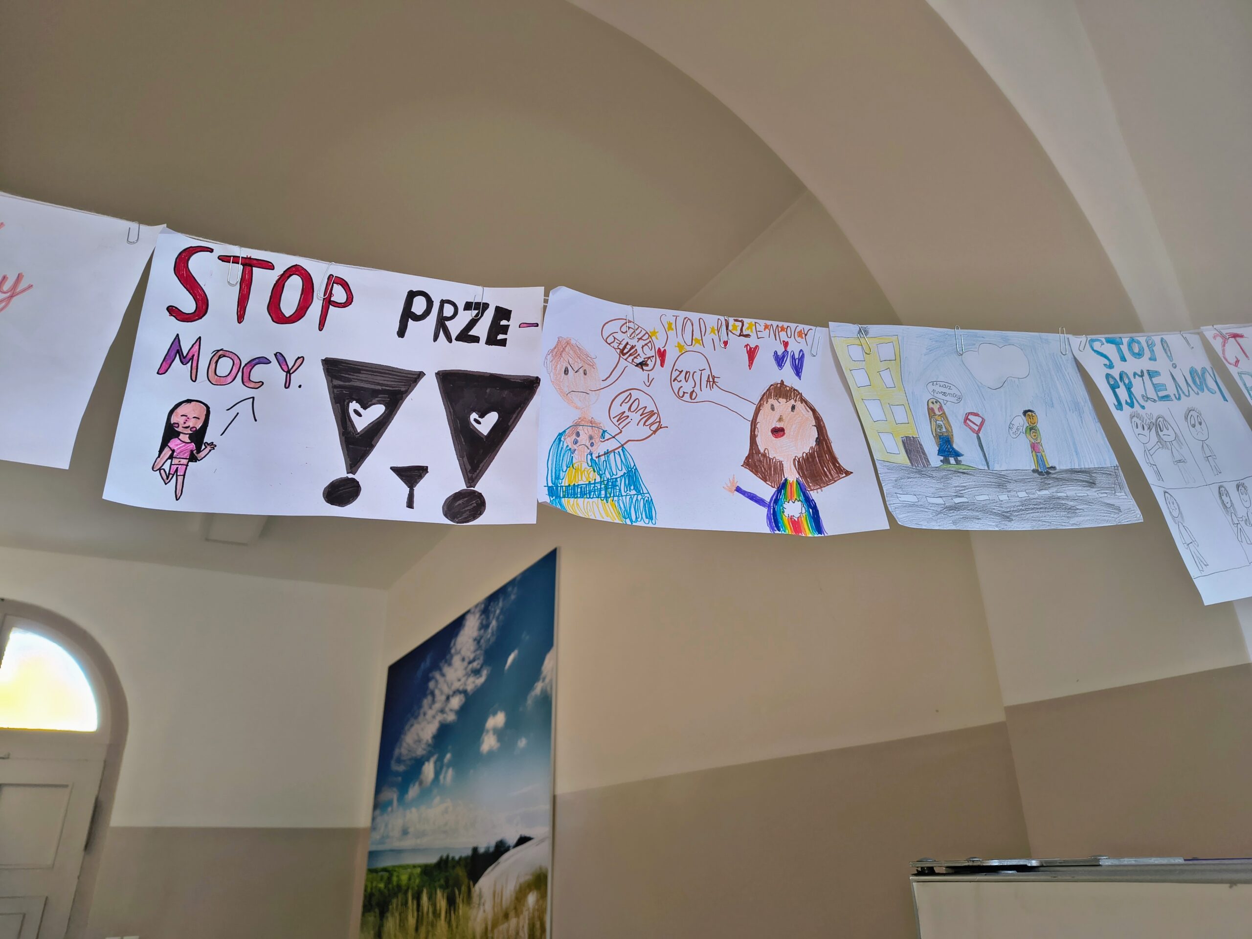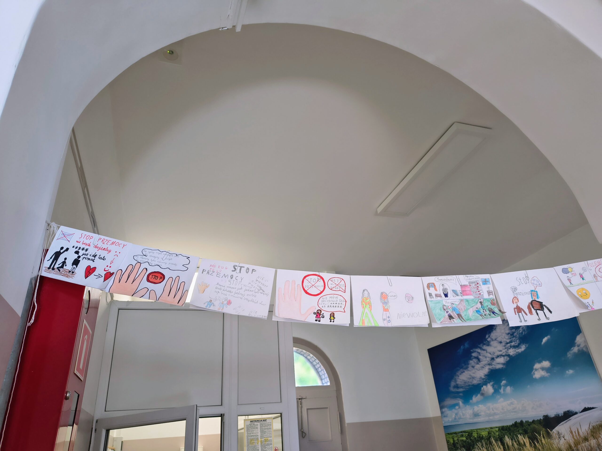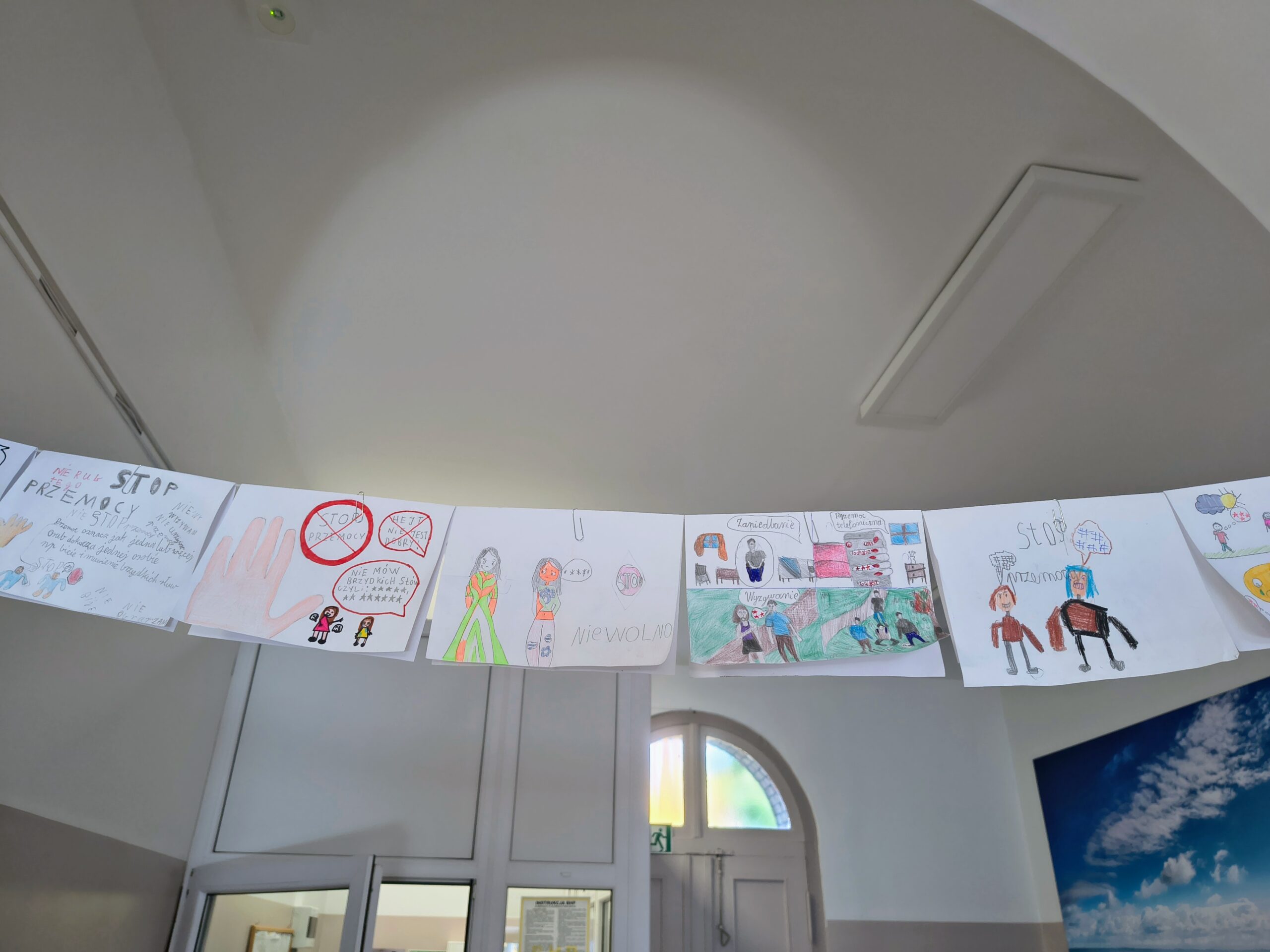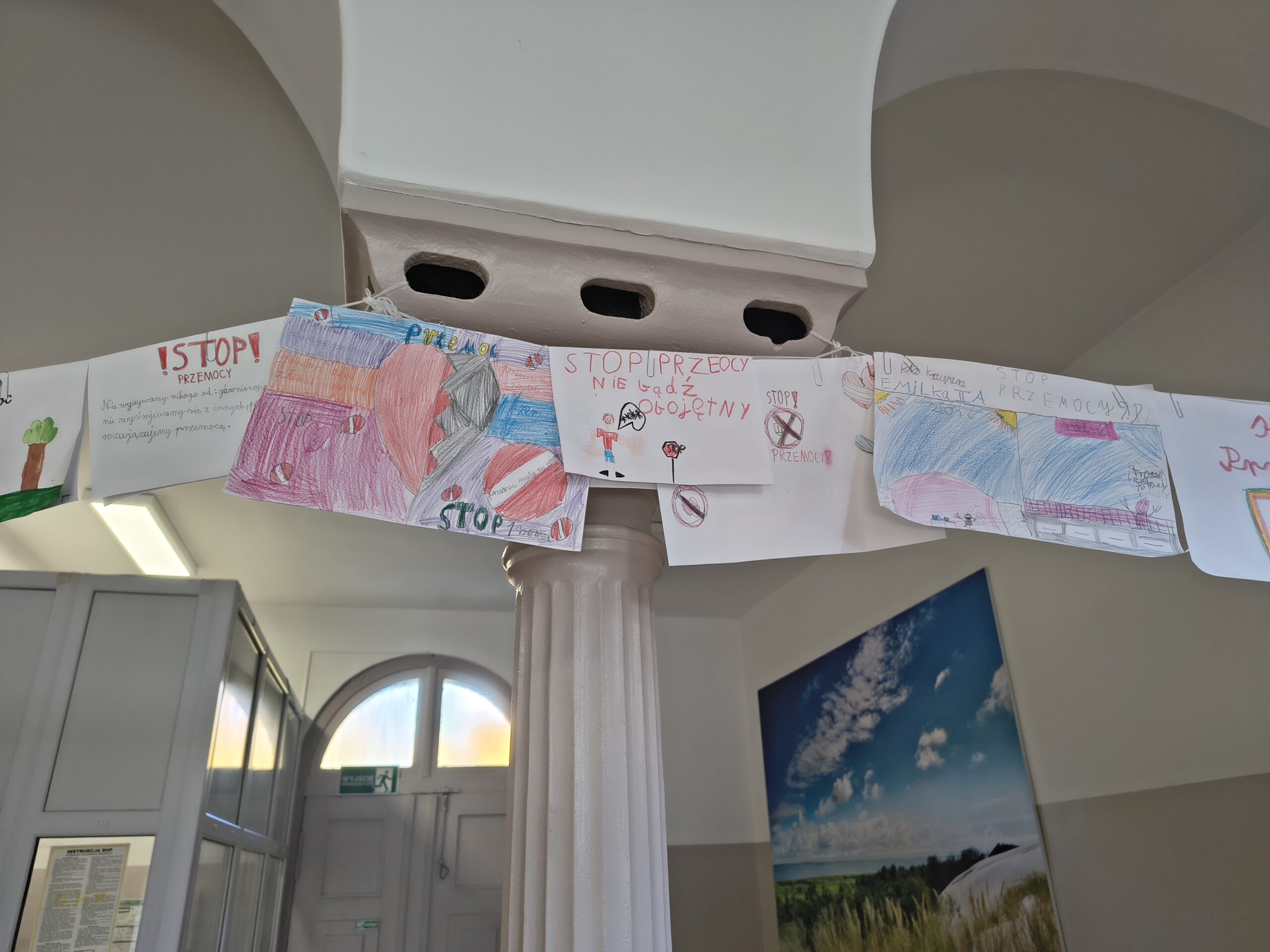 Najmłodsi uczniowie – klasy I–III – aktywnie włączyli się w obchody, przygotowując kolorowe plakaty pod hasłem „Stop Przemocy”, które ozdobiły szkolny korytarz i zwracały uwagę na potrzebę reagowania na krzywdę innych. Powstała również gazetka szkolna poświęcona tematyce przeciwdziałania przemocy, a w różnych częściach szkoły – m.in. na tablicach ogłoszeń – umieszczono materiały informacyjne wskazujące, jak postępować w sytuacji, gdy jest się świadkiem lub ofiarą przemocy, oraz jak wygląda ścieżka uzyskiwania pomocy.