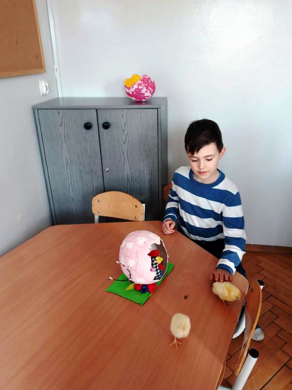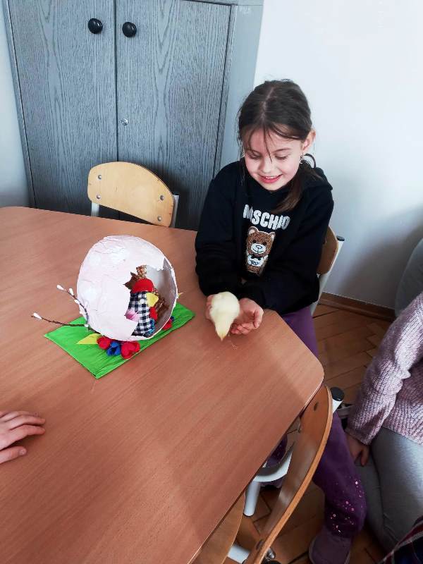 Wielkanoc to święta pełne pięknych tradycji, które warto podtrzymywać nie tylko w domu, ale również w szkole. Wielkanoc to odrodzenie i zmartwychwstanie, dlatego symbolem tych świąt jest jajko symbolizujące nowe życie. Przedświąteczny czas w świetlicy został wykorzystany na twórcze prace plastyczne. Dzieci z chęcią wykonały ozdobne jaja z gipsu i uszyły kurki z materiału. Efektem pracy dzieci są przepiękne stroiki wielkanocne, które w tym szczególnym czasie będą dekorowały ich świąteczne stoły. Miłym akcentem przed świętami w świetlicy, była wizyta jednej z mam z żywymi kurczaczkami. Każde dziecko mogło dotknąć kurczaczka i posłuchać o tradycjach wielkanocnych.